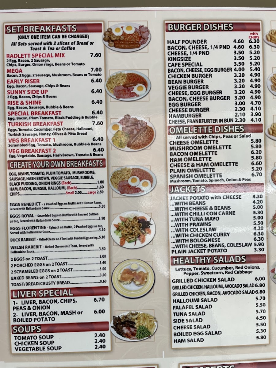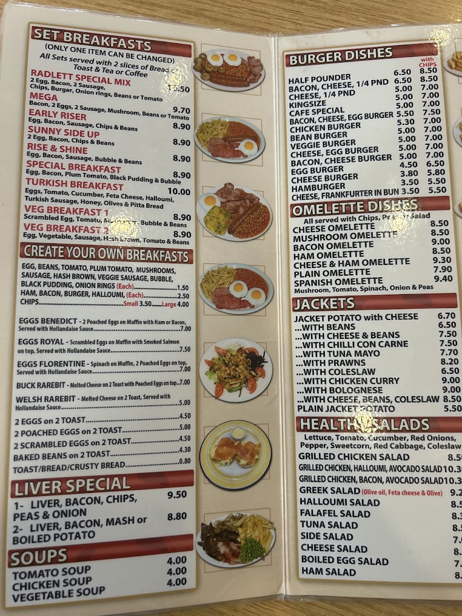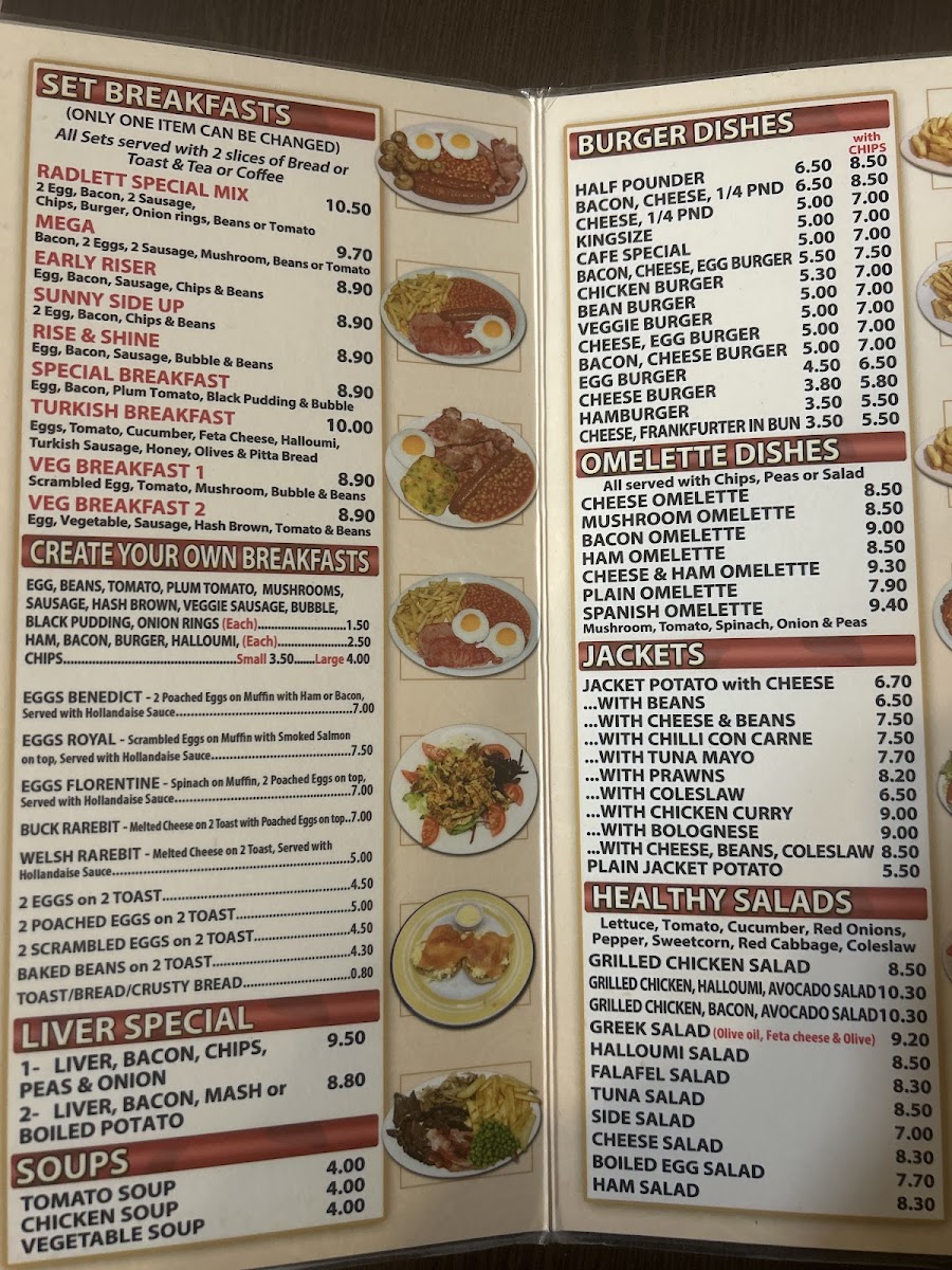 The menu boasts hearty offerings that celebrate classic English breakfasts. The standout is undoubtedly the Radlett Special Mix Breakfast, featuring perfectly cooked eggs, crispy bacon, and juicy sausages. It's no wonder that customers rave about its quality and value for money!